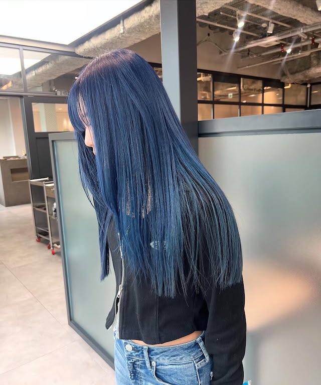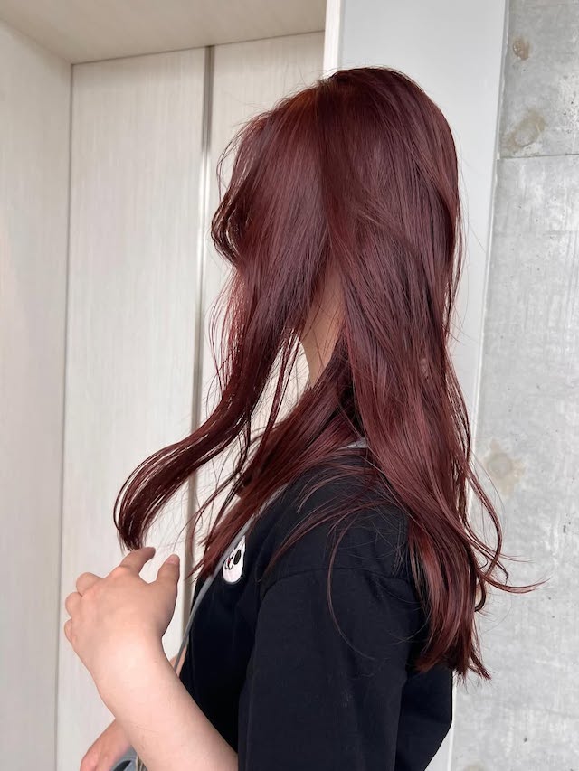 ブリーチをせずにカラーを入れると、地毛の黒や赤みが残りやすく、発色がやや落ち着いた仕上がりになります。